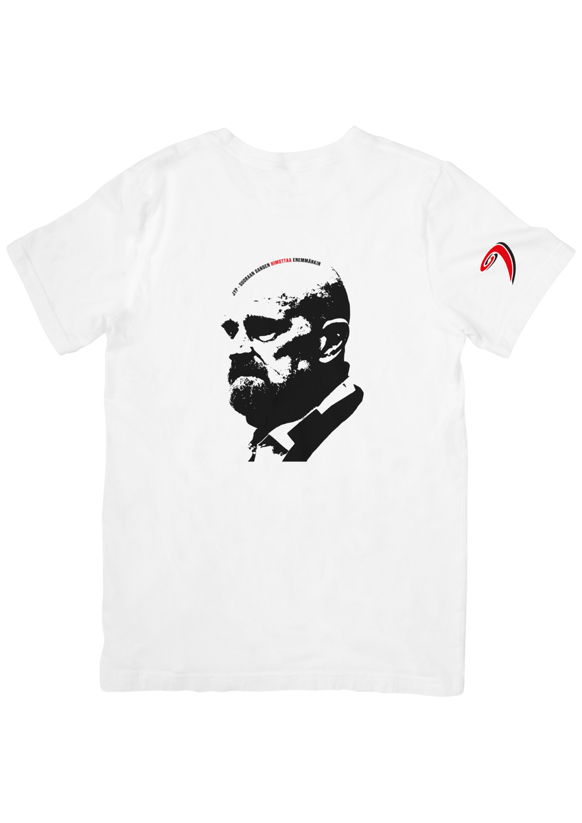 Valkoinen t-paita, jossa painatus edessä ja vasemmassa hihassa.